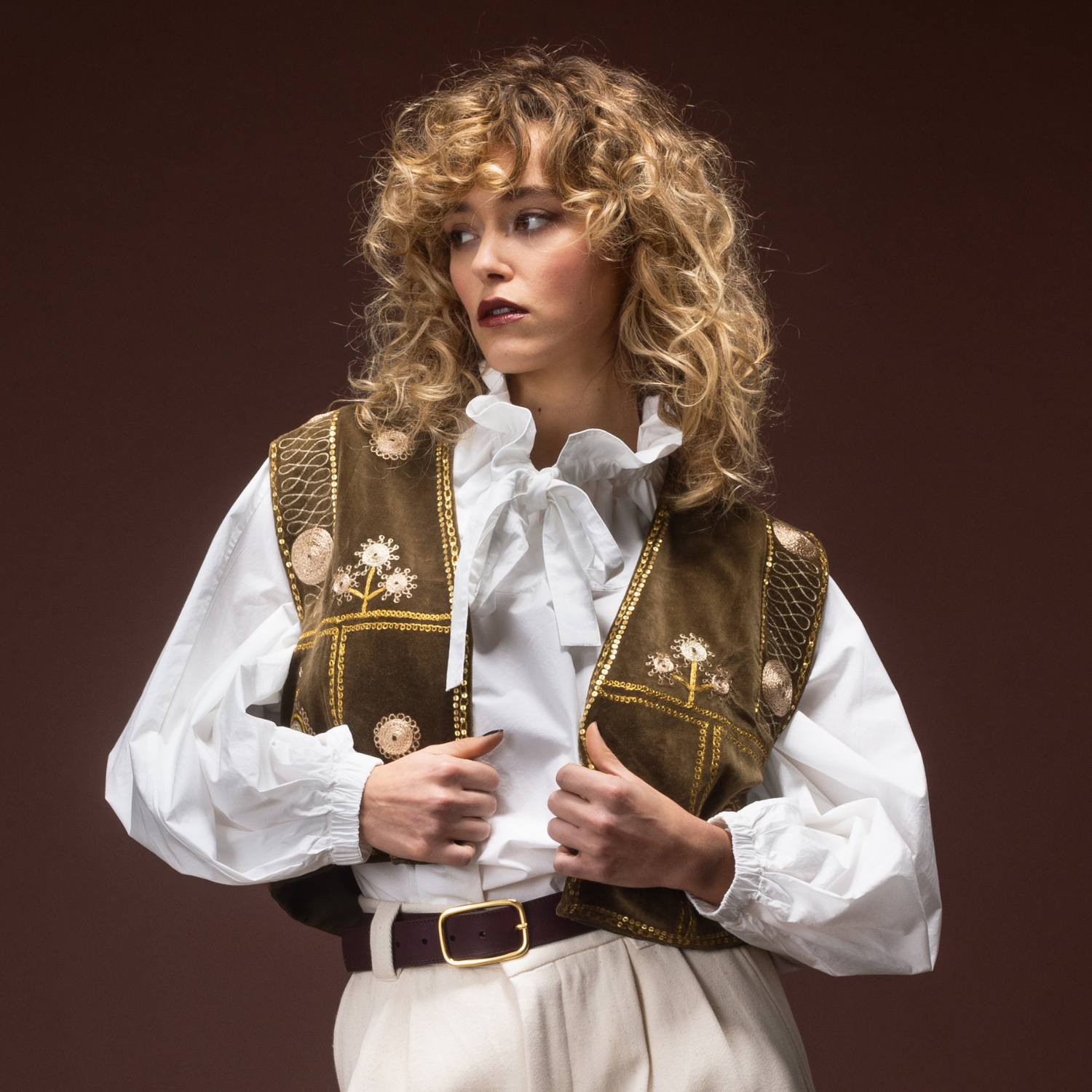 "Le gilet ceinturé en laine naturelle de la saison automne hiver 2021 fait une apparition dans un éditorial du Vogue Paris numéro 1020."