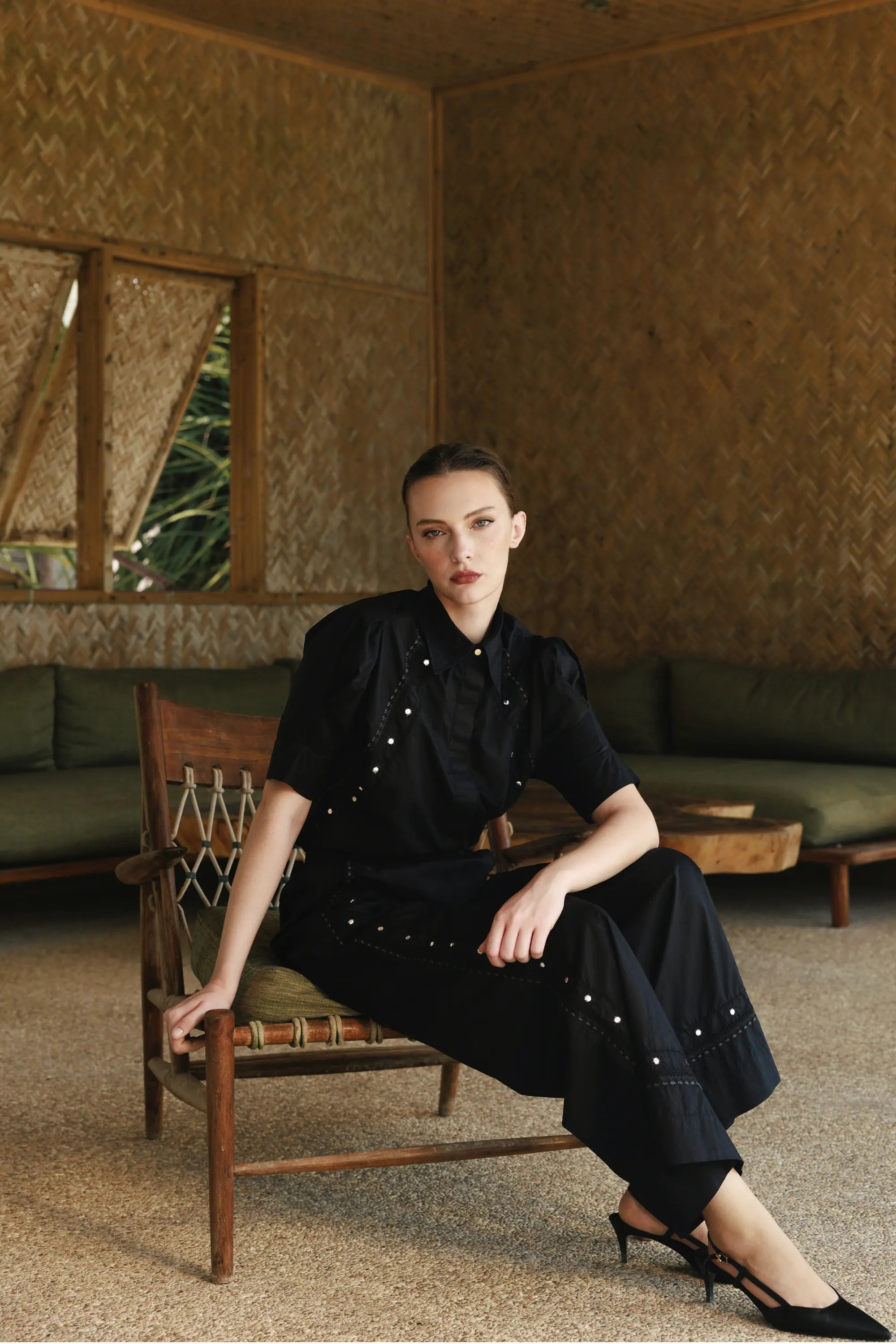 La chemise à manches courtes LOS ANGELES en popeline de coton noir met à l'honneur un travail de broderie ponctué de petits miroirs cousus à la main. Chic et élégante, elle peut se porter pour différentes occasions.